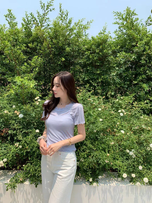 Thu. 顯嫩少女波浪袖兩件式疊穿上衣 藍