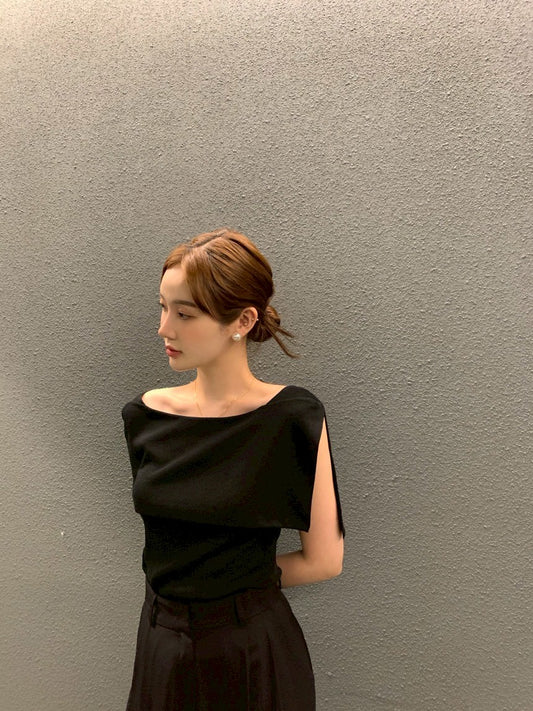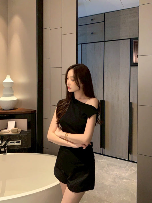 Thu. 元氣少女不規則斜肩顯瘦上衣 黑