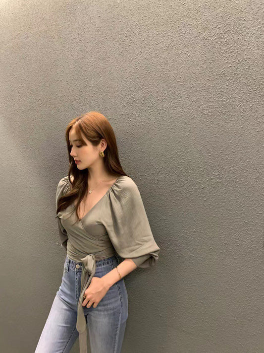 Thu. V領顯瘦短款綁帶雪紡衫 豆沙綠