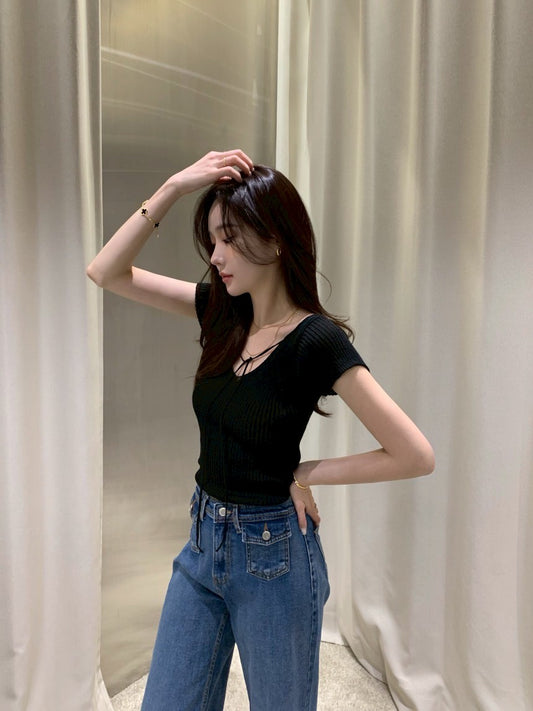 Thu. 瘦瘦針紙衫 V領兩穿美背小綁帶設計上衣 黑