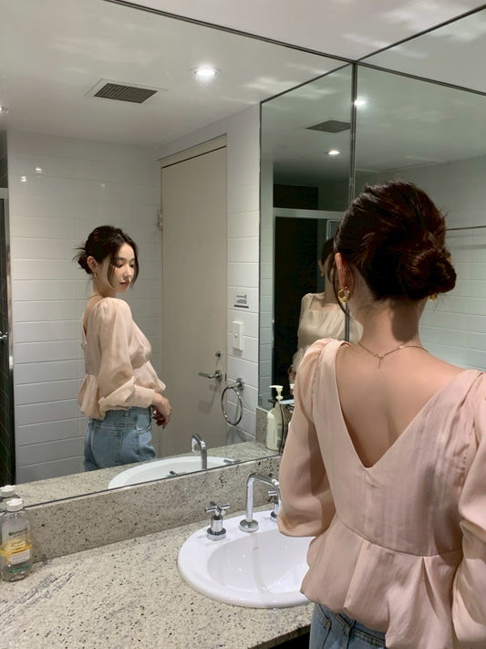 Thu. 氣質法式方領公主泡泡袖上衣 粉