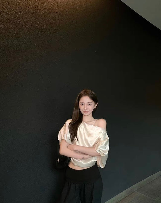 Mon. like Jennie 泡泡緞面珍妮後台同款一字領上衣 白