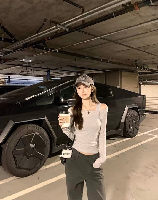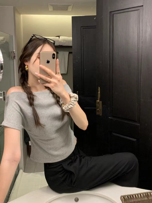 Thu. 漢南洞歐尼 氣質一字領小露背上衣 灰