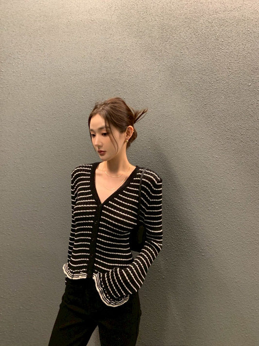 Thu. 休閒私服 拿鐵可可條紋V領針織開衫 黑底