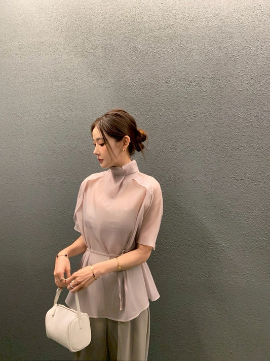 Thu. 高級名門貴氣高領繫帶襯衫 裸粉/黑