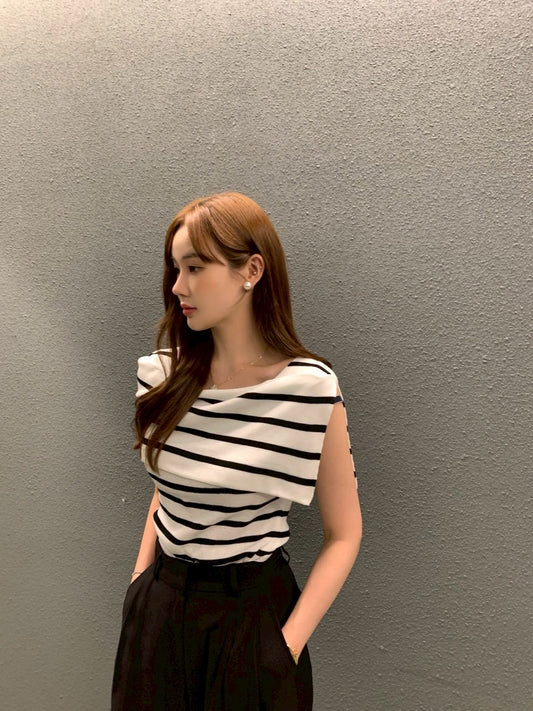 Thu. 漢南洞歐尼 氣質一字領小露背上衣 紅條紋
