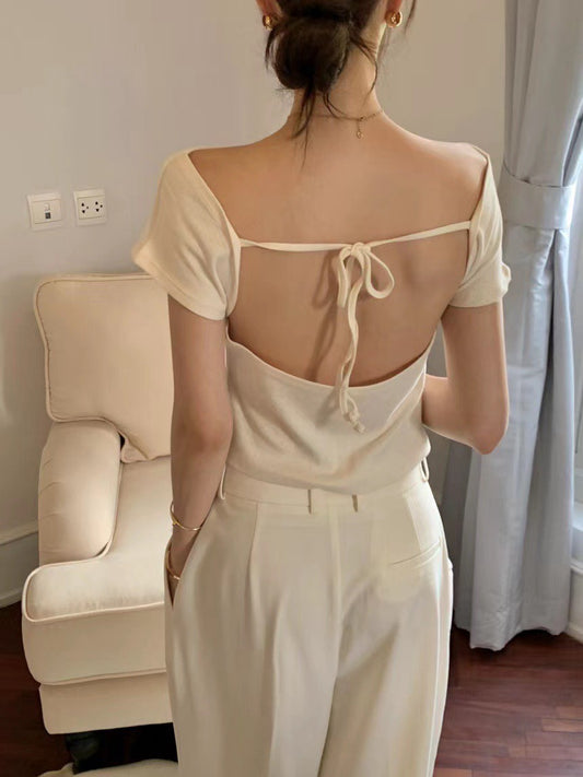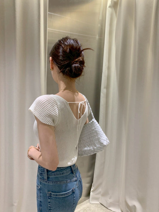 Thu. 瘦瘦針紙衫 V領美背小綁帶設計上衣 白/淺藍