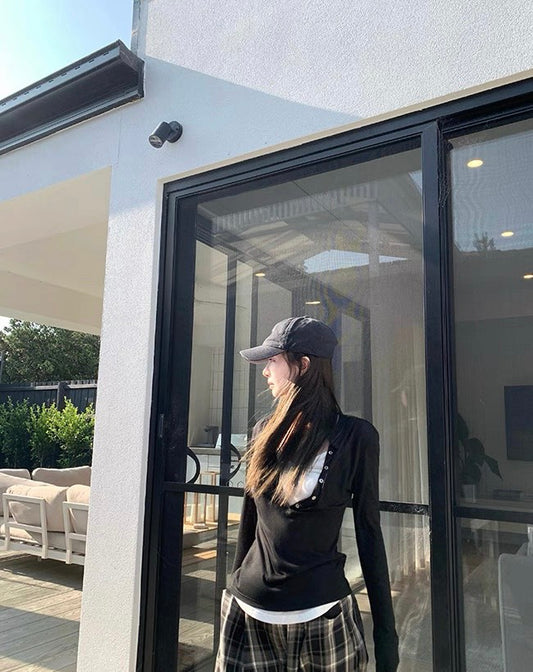 Mon. 淺色春夏 薄款假兩件式背心長袖疊穿上衣 淺灰