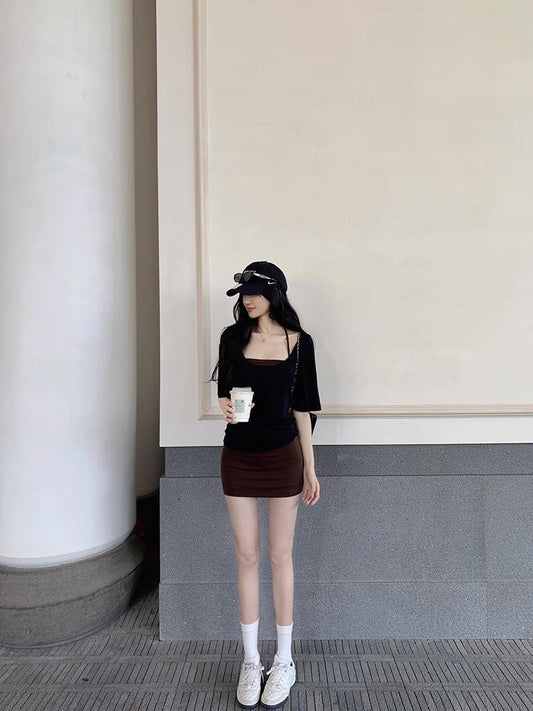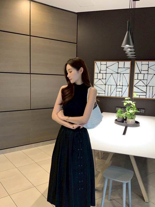 • Thu. 韓劇老錢簡約高領顯瘦針織背心 高腰開叉半身裙 黑