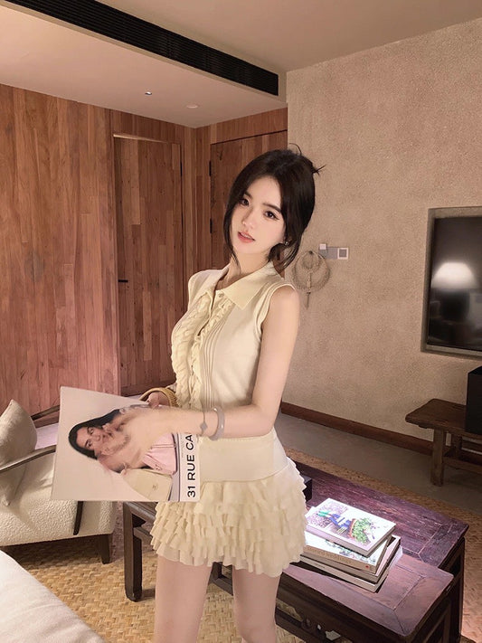 Mon. 嬌嫩甜心 俏皮木耳邊針織背心蛋糕半身裙套裝 杏