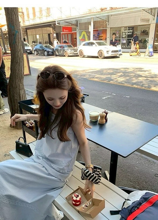 • Fri. 法式氣質邦苔美女圓領背心高腰半身裙套裝 藍