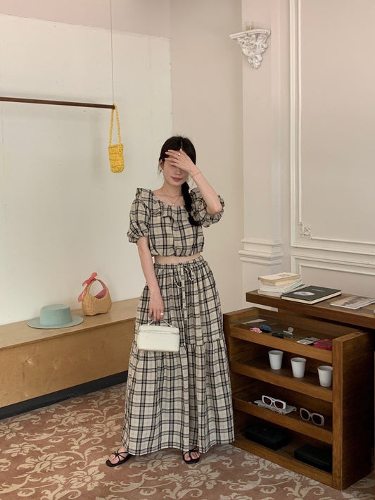 Mon. 韓系度假格紋泡泡袖半身裙套裝