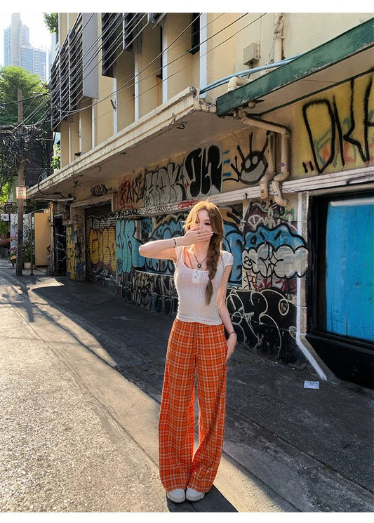 • Mon. 橘子汽水 甜妹格紋內搭 休閒褲兩版型 白色外罩衫