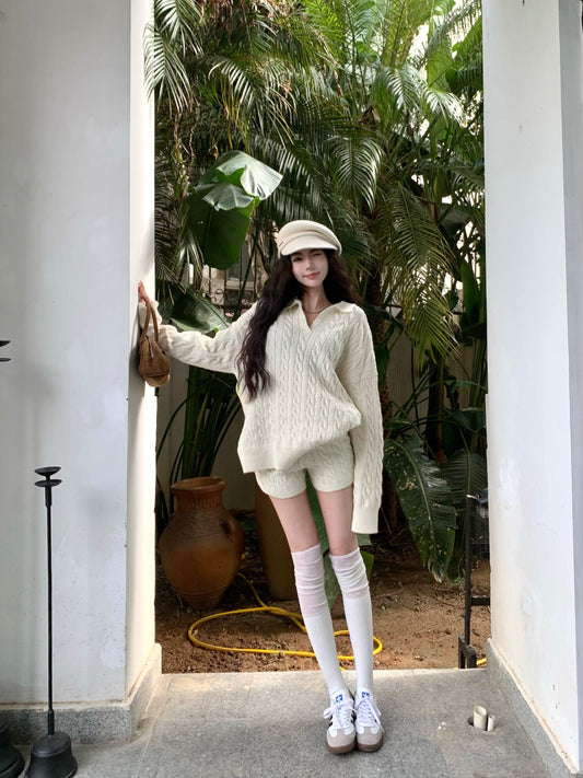 Sat. 經典老錢 奶白polo領麻花毛衣 短褲