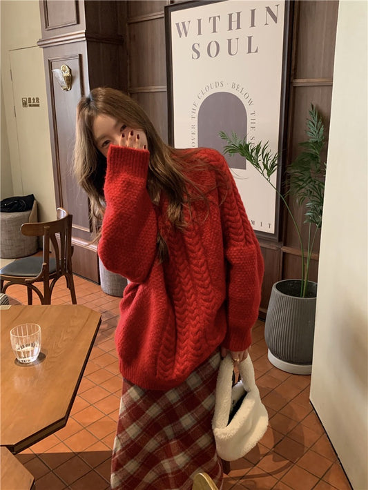 Fri. 復古節慶日 V領麻花針織上衣 格紋半身裙 紅