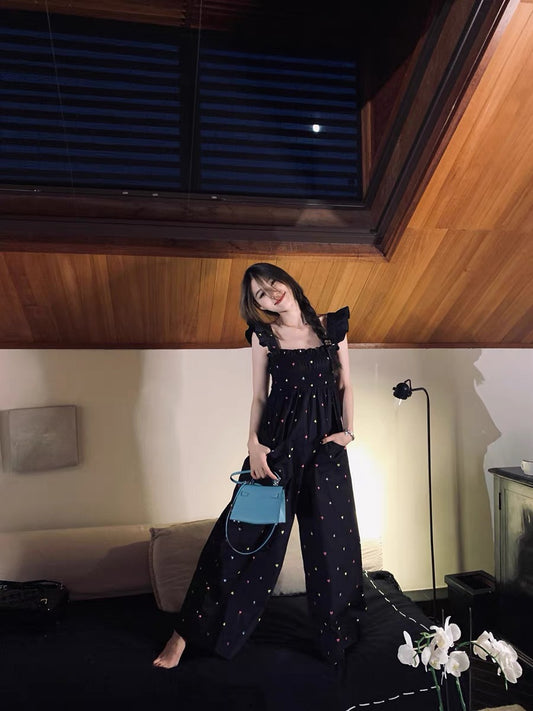 Sun. 可愛愛心刺繡小飛袖連身褲