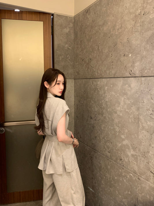 Tue. 韓系女主氣質翻領長款襯衫闊腿褲套裝 卡其