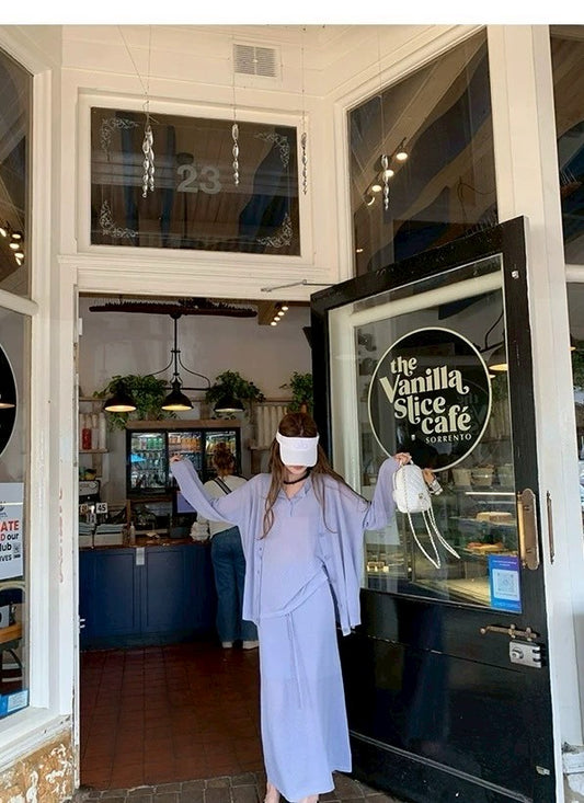 Mon. 雪頂銀鹽 百搭抓襟花邊圓領襯衫半身裙套裝 藍