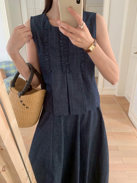 Fri. 法式氣質邦苔美女圓領背心高腰半身裙套裝 藍