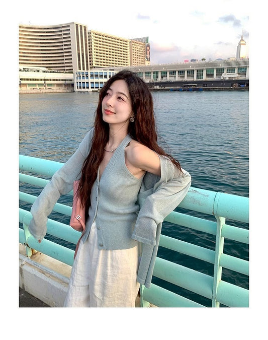 Thu. 自由領落仿天絲亞麻針織上衣2件套 鹽藍
