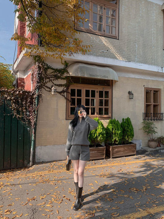 Fri. 慵懶立領針織短褲套裝 灰/米