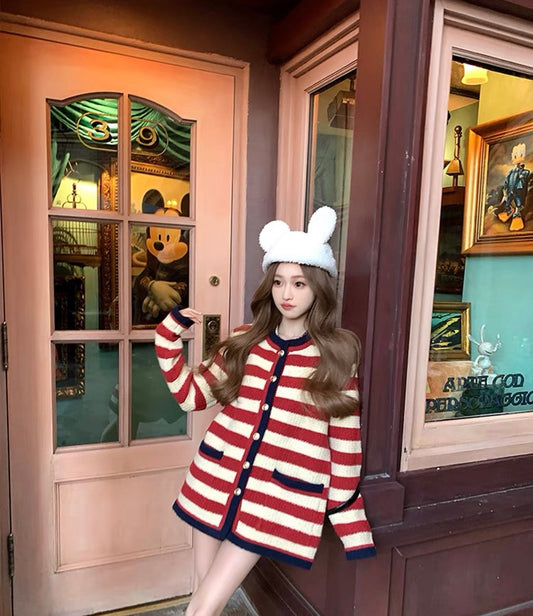 Sun. 節日條紋拼色圓領針織外套