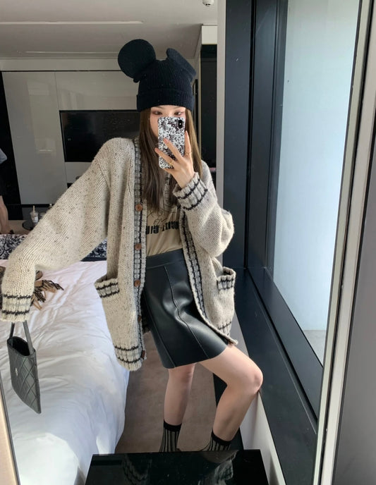 Sat. 暖秋卡其 高克重撞色線條針織外套 米灰