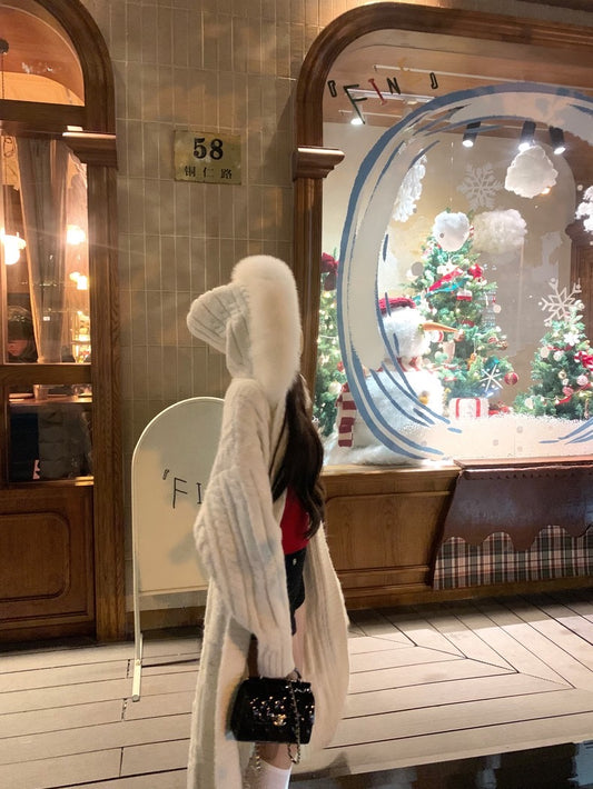 Wed. 雪兔精靈重磅 大毛領皮草麻花針織長款外套