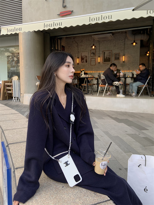 Sat. 南法河畔 雙排扣西裝領針織上衣 半身長裙 深藍