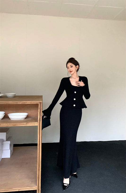 Wed. 優雅法式收腰針織開衫 方領連身裙 黑