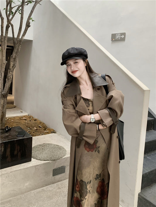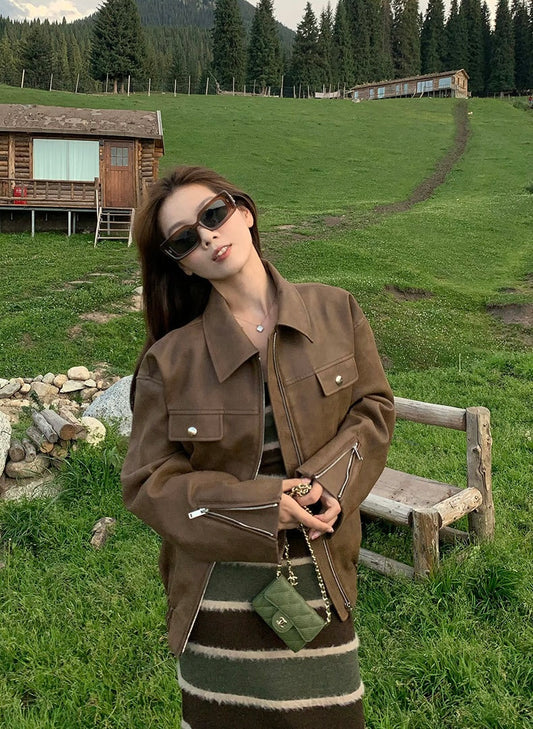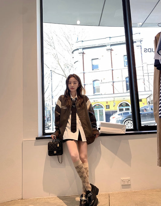 • Sat. Towngirl復古拼色皮衣棒球外套 棕