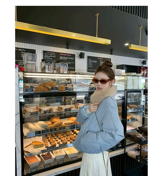 Thu. 卡斯托鎮仿狐狸毛領瘦瘦羽絨外套 藍