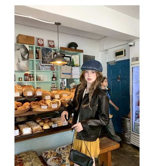 Thu. 黑皮手冊翻領中短款修身皮革外套