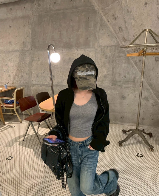 Tue. 倫敦街頭鉚釘連帽純色棉外套 黑