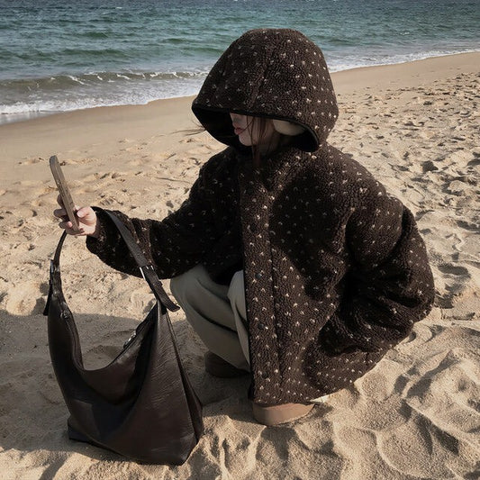 Fri. 熱呼便利店愛心波點羊羔毛連帽外套 咖/灰