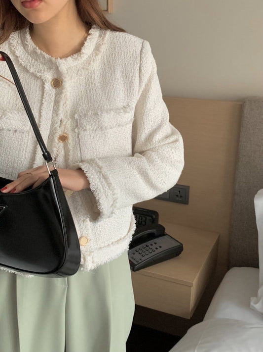 Thu. 小香粗呢鬚邊廓形西裝外套 白/黑