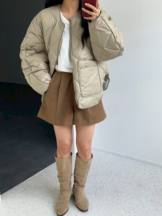 Thu. 復古菱格紋泡芙輕羽絨外套 綠/黑/米