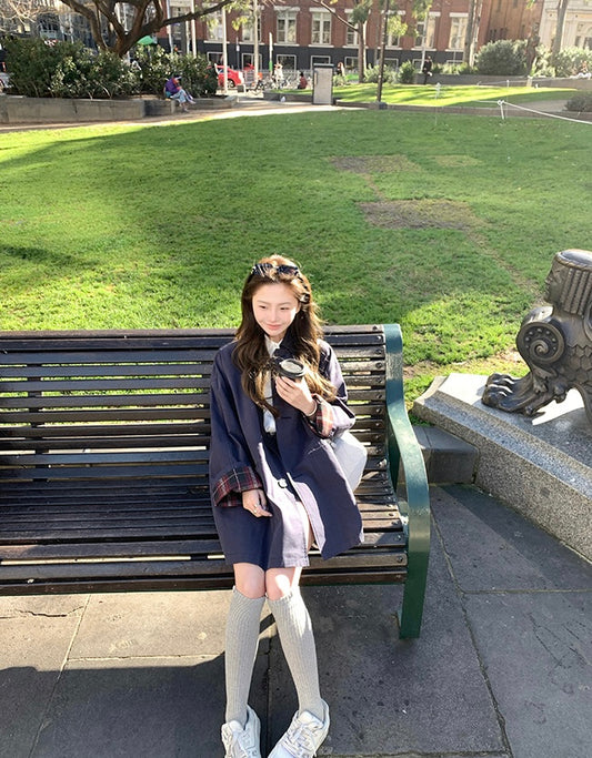 Sat. 冬日巴塞爾 格紋撞色底廓形百搭風衣外套 藏藍