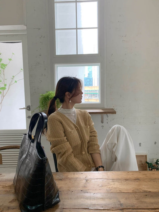 Wed. 氣質通勤單排金釦肌理針織外套 卡其