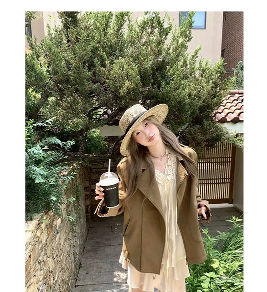 Thu. 博西雅重工時髦休閒皮衣夾克 卡其
