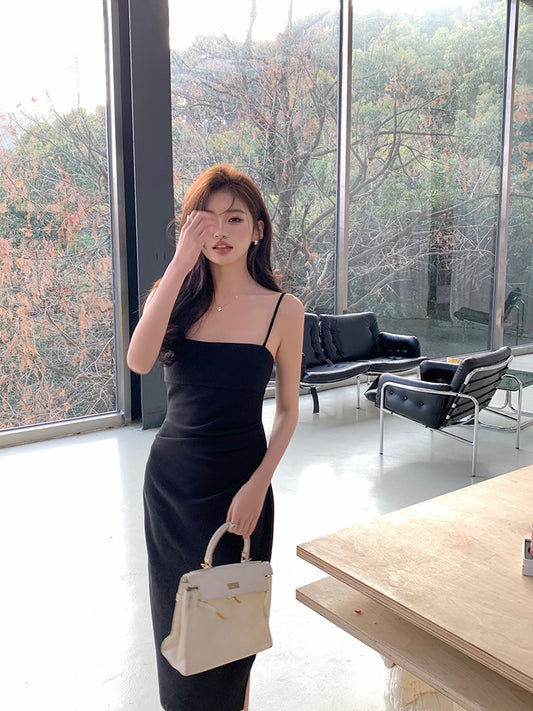 Sun. 清爽法式抽繩顯瘦吊帶連身裙 黑/白