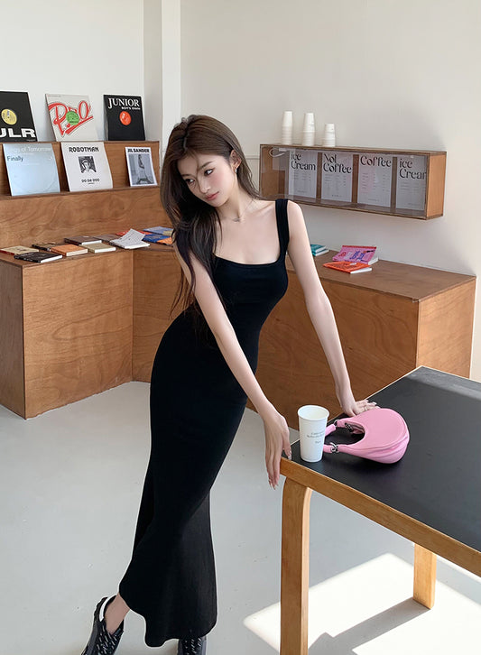 Sun. 休閒方領彈力魚尾連身裙 黑/灰