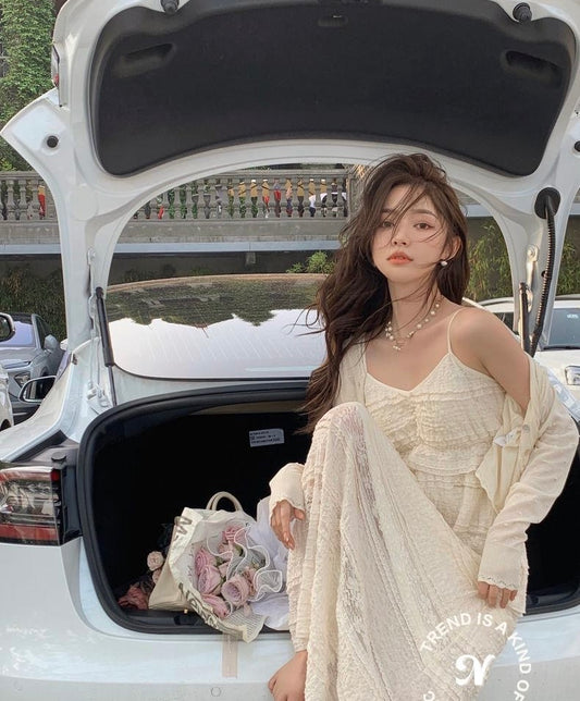 Sun. Love芍藥調 顯白紫毛衣外套 蕾絲拼接收腰連身裙