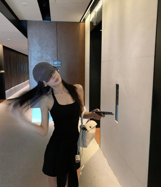 Sun. 懶人穿搭 顯瘦假兩件式吊帶連身裙 黑/灰