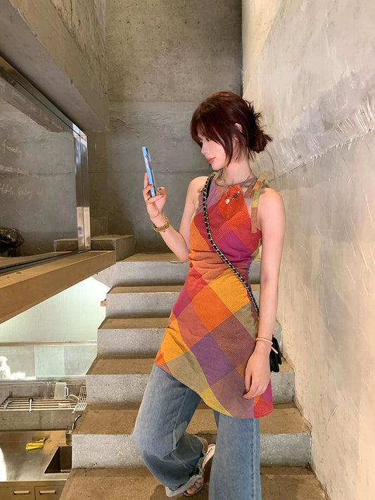 Wed. 橘色落日復古撞色格紋綁帶連身裙