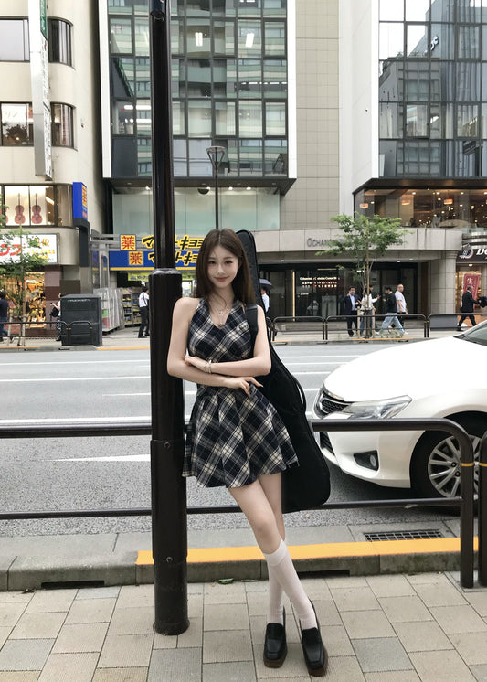 Tue. 昭和少女 日系感格紋削肩收腰連身裙