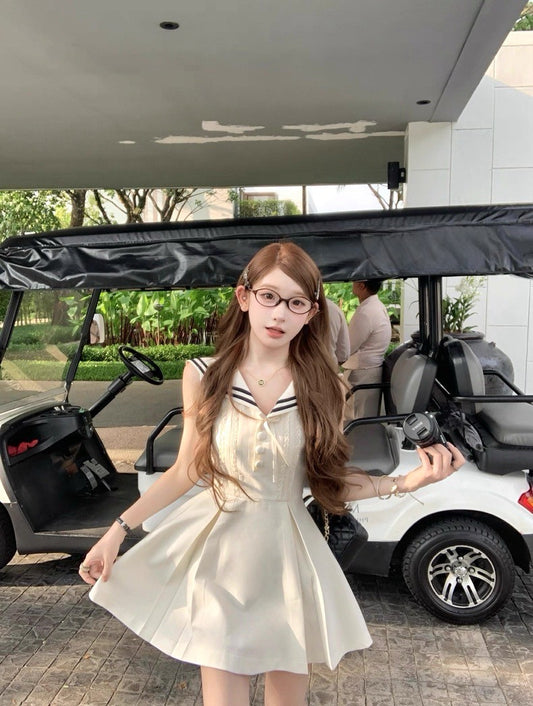 Mon. 六本木學院海軍領 木耳背心連身裙 米白