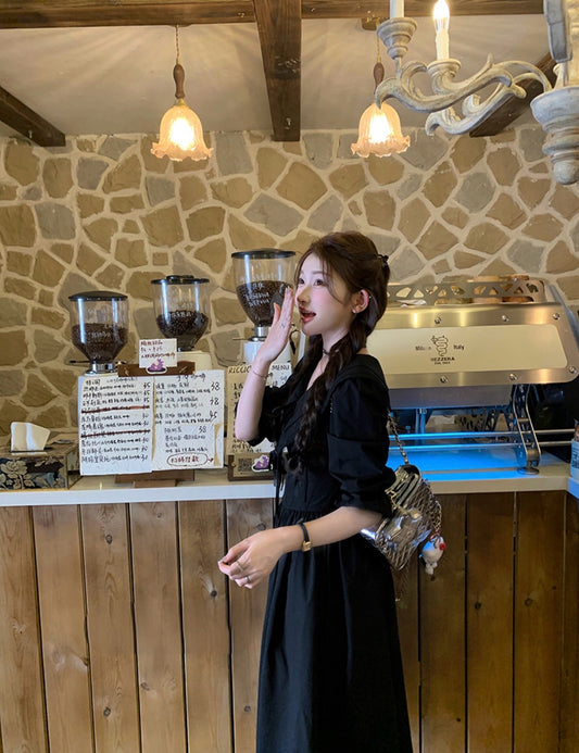 Mon. 出逃千金 翻領蝴蝶繫帶收腰連身裙 5分袖版 黑色