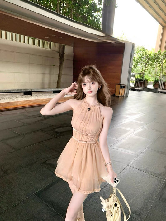 • Mon. Sorbet微醺裸粉-掛脖木耳花邊奶油紗連身裙 短款/長款