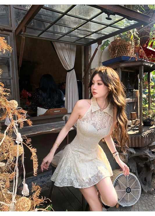 Mon. 奶慾陷阱蕾絲襯衫領掛脖夢幻連身裙